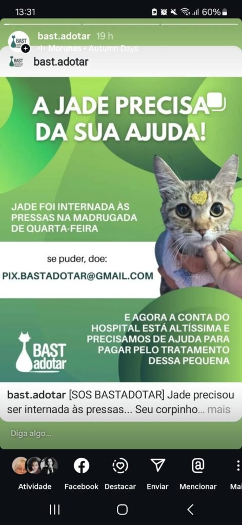 SAIBA MAISExistem inúmeras maneiras de ajudar nossa ONG. Atualmente, estamos com uma imensa demanda de afazeres e precisamos de voluntários para: - Visitas ao abrigo (brincar, limpar, medicar, etc). - Transporte (de animais ou doações). - Redes Sociais (facebook e instagram: conteúdo, design, comunicação). - Administração (financeiro, gerência). - Criação de produtos exclusivos. - Lar temporário entre outros, Mas você também pode contribuir financeiramente conosco, toda ajuda é bem vinda. Siga-nos no instagram: @bastadotar para maiores informações.